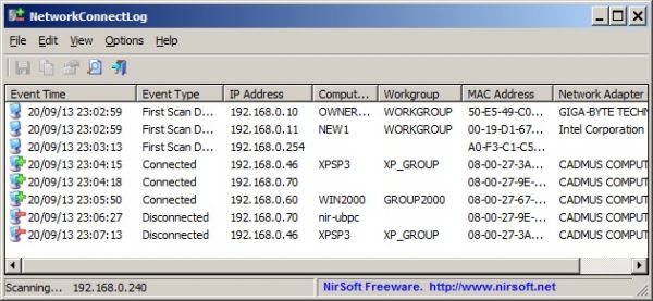 NetworkConnectLog - удобное приложение, которое постоянно мониторит сеть и ведет лог в журнале. Когда происходит подключение оборудования к сети или его отключение, утилита автоматически фиксирует эти данные в журнале.