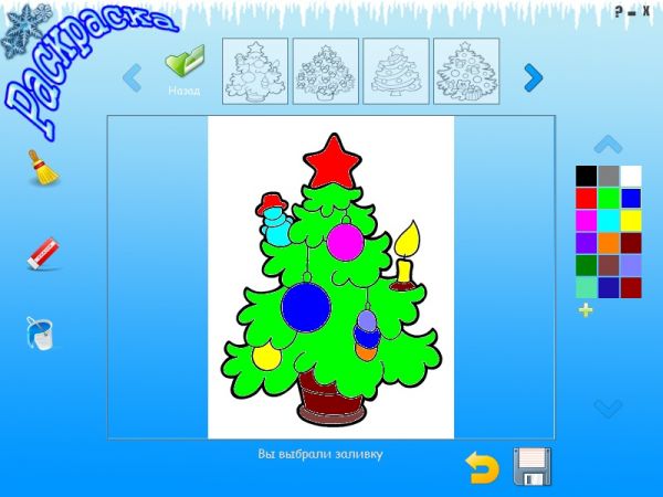 Увлекательная, бесплатная программа новогодней тематики для детей, которая позволит ребенку весело провести время за раскрашиванием новогодних картинок. Программа содержит разные картинки новогодних елочек, дед морозов и другие изображения для раскрашивания. Удобная сортировка картинок на разные темы по папкам. Разукрашенное изображение можно сохранить на компьютер. Программа не только приносит ребенку радость в рисовании, но и улучшает восприятие цветов, развивает мышление и фантазию. Ребенок должен развиваться, а не только играть в игры, и эта программа в этом поможет.