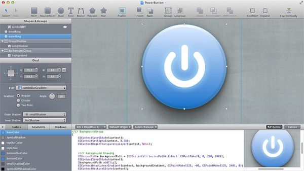 PaintCode является редактором векторной графики, который генерирует Objective-C код в режиме реального времени.