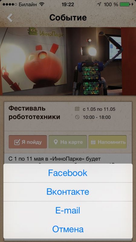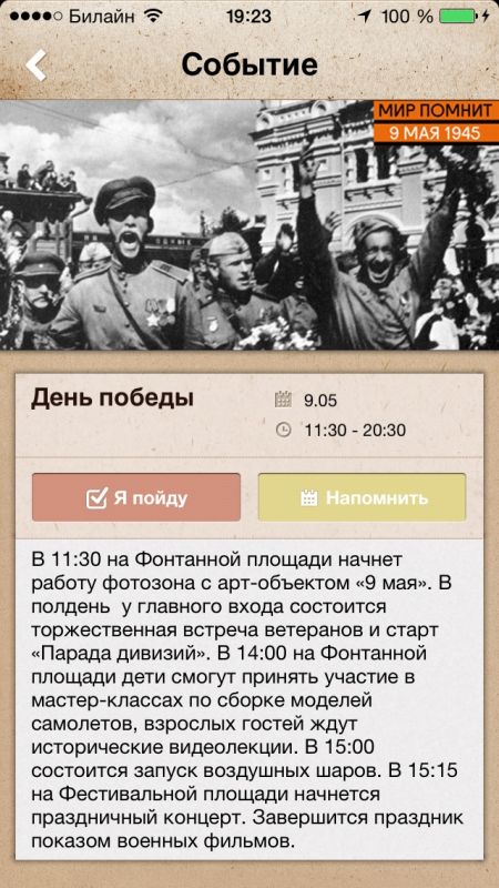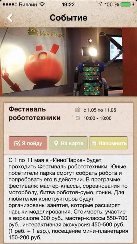 С помощью раздела календаря событий вы будете в курсе обо всех грядущих мероприятиях - выставки, конференции, концерты, соревнования и т.д. Приятный дизайн.