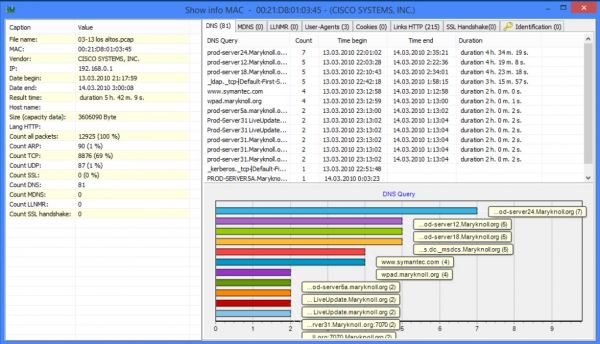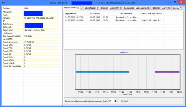 • Детальный просмотр выбранного МАС адреса из загруженного файла (отображение COOKIES, USER-AGENTS, сетевое название выбранного хоста и т.д.)