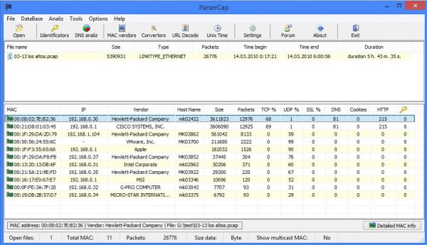 ParserCap - визуальный инструмент для анализа сетевого трафика, предназначенный для специалистов в области информационной безопасности, системных администраторов, студентов и т.д. у которых есть необходимость в проведении технического анализа трафика записанного в формате PCAP (libpcap - ETHERNET и IEEE 802.11). Так же есть возможность создавать фильтры для поиска ключевых слов в TCP заголовках (Документы, Мультимедия, Файлы, Логины, Пароли т.д.). При необходимости просматривать подробную статистику по каждому МАС адресу, включая COOKIES, USER-AGENTS, HTTP GET/POST и многое другое.