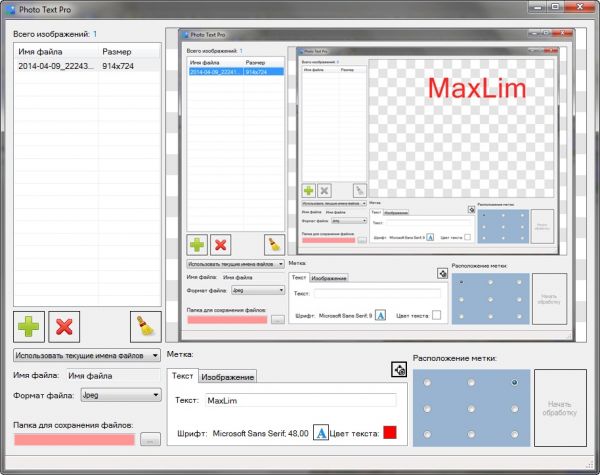 Бесплатная программа для пакетной обработки изображений, а именно для нанесения метки на изображения. Метка может быть как текстовая (размер текста, цвет и шрифт настраивается), так и графическая. Метку можно расположить в разных местах экрана, а также производить прозрачность метки и смещение относительно выбранного положения. Гибкие настройки программы позволят не только размещать метку где требуется, но и указать какое имя дать обработанным изображениям, и в какой формат перевести готовые изображения. Обработка изображений происходит быстро. Программа имеет легкий и интуитивно понятный интерфейс, в котором можно без труда и быстро разобраться.