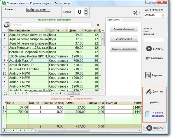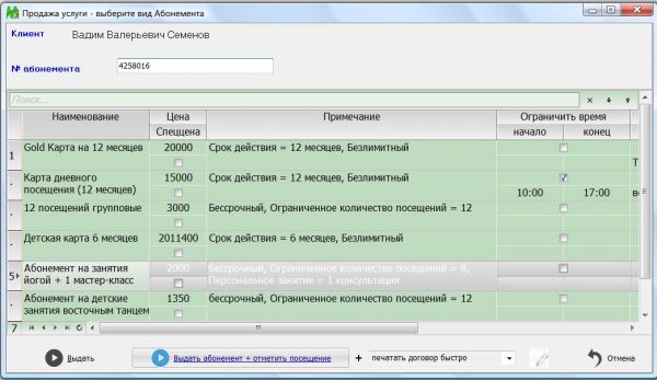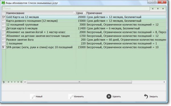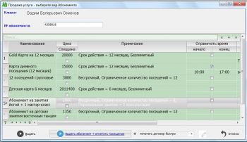 Составляете список предлагаемых услуг, абонементов и клубных карт. Вводите в таблицу продаваемые товары (например,напитки) и получаете полный учет выручки и Ваших клиентов.