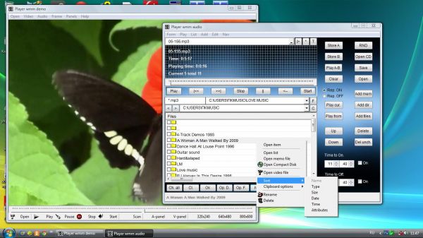 Player wmm - специализированный инструмент для произведения файлов различного формата: mov, avi, wmv и аудио wma, wav, mp3, rmi, mid и cda. Громкость можно настроить через микшер, также имеется таймер на отключение и включение воспроизведения.