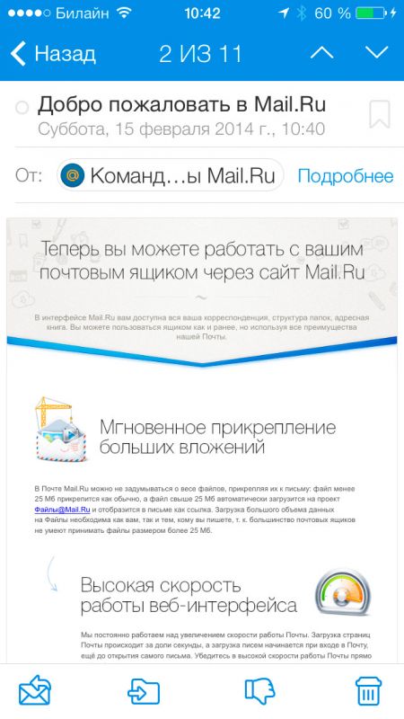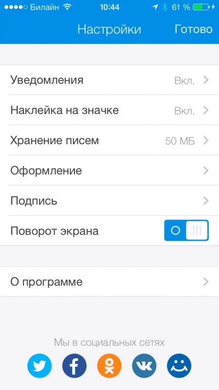 Удобное приложение для работы с почтой от Mail.Ru. Современный, удобный, красивый дизайн. Поддерживает работу не только с почтой от mail.ru, но также с почтой от Яндекса, Рамблера, Gmail и др. В отличае от стандартной программы чтения почты в iOS, настройка почтового ящика в данном приложении предельно проста. В большинстве случаев не нужно вводить сложных настроек, знать что такое POP3 или IMAP, а достаточно просто ввести логин и пароль. Если сравнивать российские почтовые программы от Яндекса и mail.ru под iOS, то в данном случае приложение mail.ru выглядит намного более удобным и современным. На данный момент.