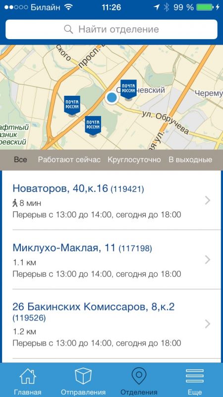 - Поиск ближайших отделений на карте.