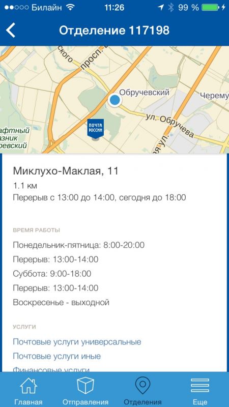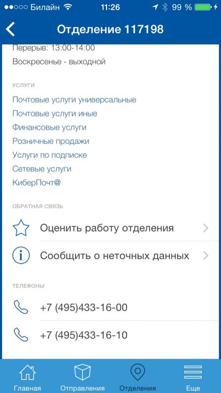 - Информация о почтовом отделении: телефон, режим работы, отзыв о работе и т.д.