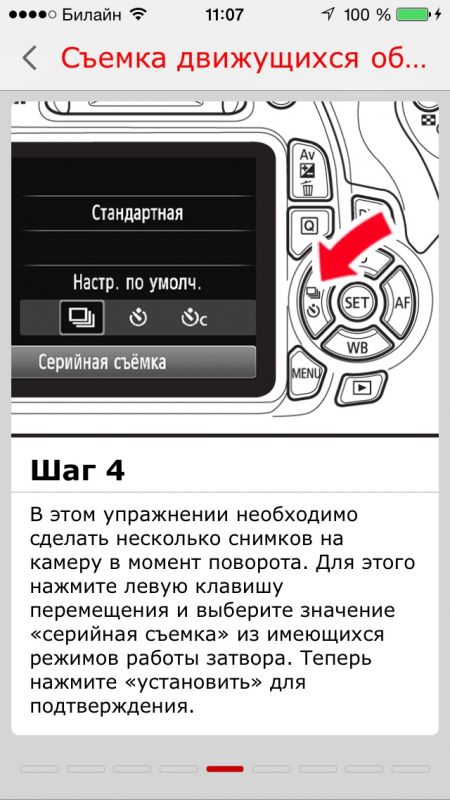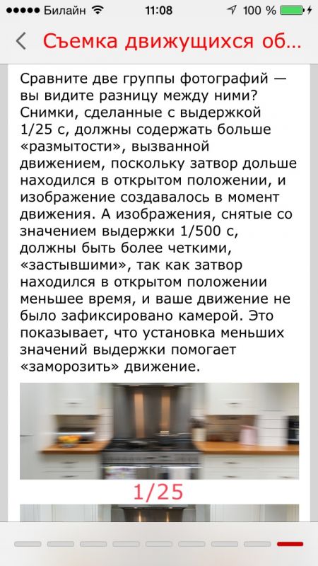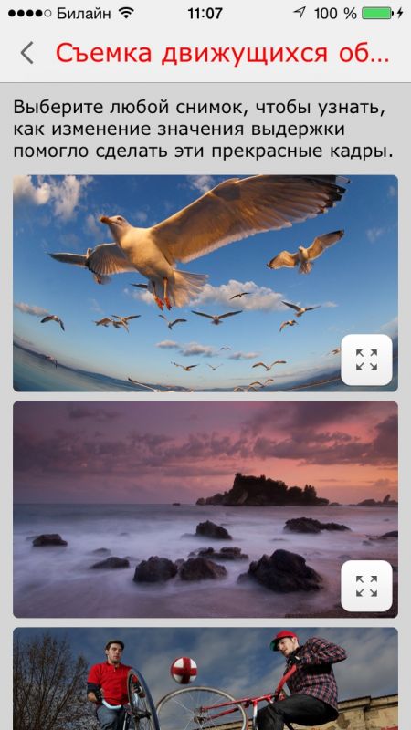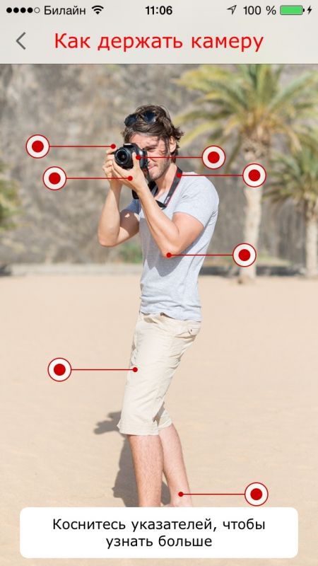 Приложение создано в стиле "для чайников", много детальных фотографий и видеозаписей о том как правильно фотографировать в различных ситуациях. Процесс изучения построен очень понятно и увлекательно.