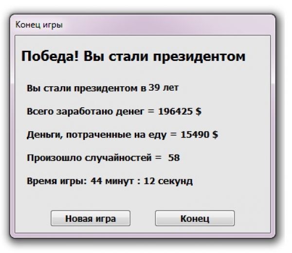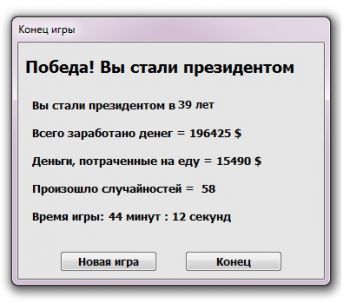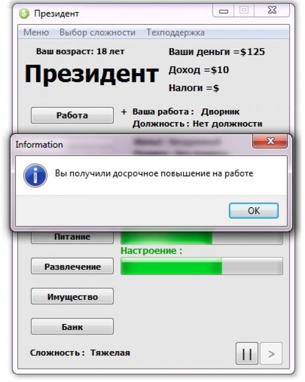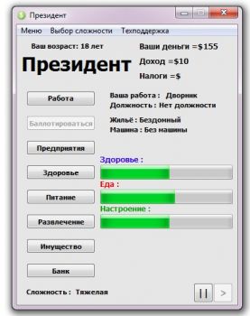 Ваша задача проста: пройти путь от дворника до президента. Однако путь этот будет не совсем простым. Вас поджидает множество случайностей, и не все из них - положительные. Нехватка денег, чрезмерные налоги, хулиганы... С вами может случиться все, что угодно. Сможете ли вы стать президентом, обойдя все препятствия? Попробуйте и узнаете!