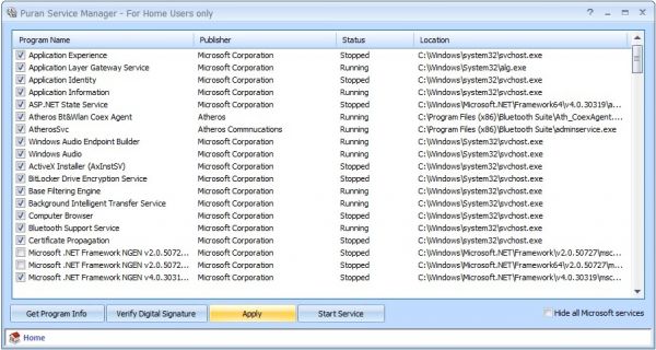 Puran Service Manager - небольшая утилита, благодаря которой можно управлять всеми процессами Windows. После запуска программы, вы увидите, какие сервисы и процессы запущены в текущее время и сможете контролировать их. Для этого устанавливайте или снимайте соответствующие галочки.