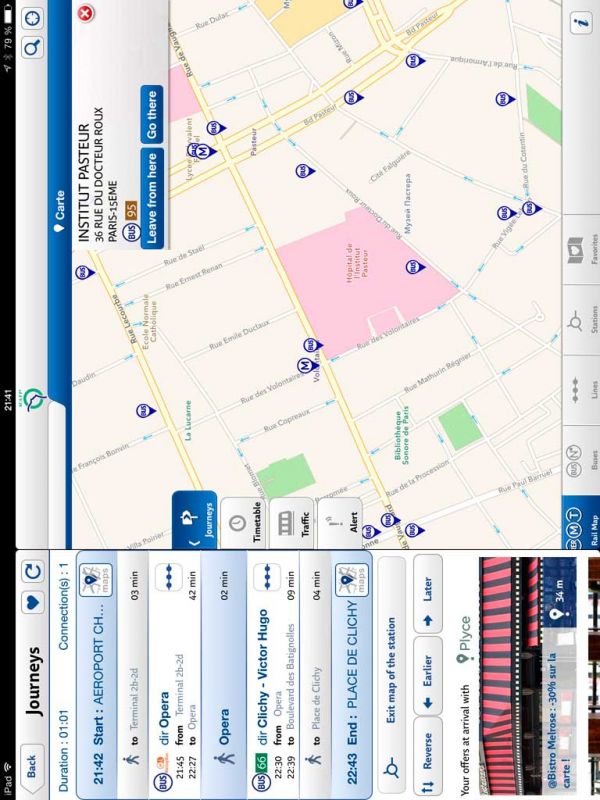 RATP - официальное приложение парижского метро и пригородных электричек. Содержит детальную схему метро и наземного транспорта. Есть функция прокладывания маршрутов. С помощью мобильного приложения RATP вы сможете оперативно узнать какие станции метро и транспорта находятся рядом с вами. Приложение показывает расписание и другую актуальную информацию в режиме реального времени.