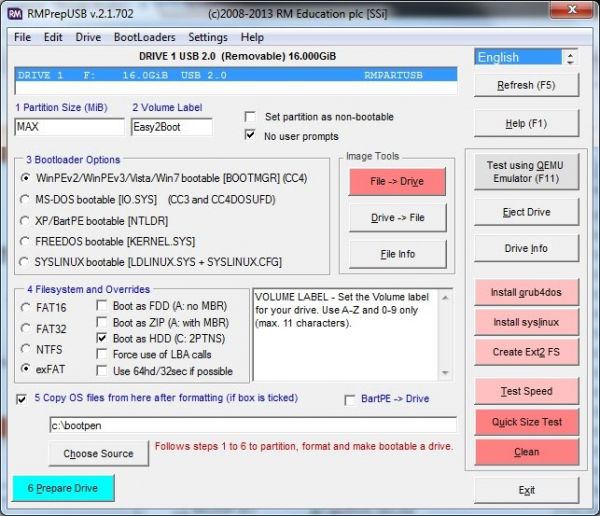 RMPrepUSB - отличный инструмент, созданный с целью создания загрузочной флешки. Перед началом работы, приложение отформатирует ваше USB устройство и предложит вам создать несколько разделов.