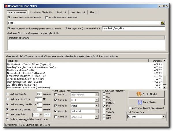 Благодаря Random MixTape Maker, можно создать случайные плейлисты, по размеру, длительности, содержанию и композициям. Для создания, просто выберите директорию, укажите параметры, и утилита автоматически создаст требуемую дорожку.