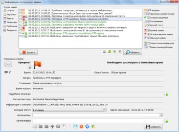 Редактируемая база знаний. Возможность изменения в описании заявок и создания своей структуры заявок. Программу можно использовать в любых других целях, если это связано с отправкой заявок и их обработкой. 3 уровня описания заявок: общее название, уточнение и подробное описание.