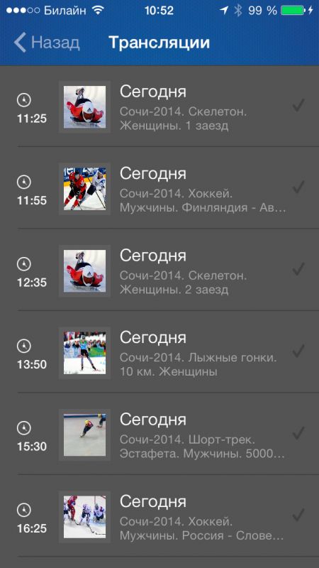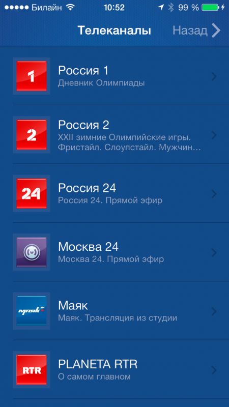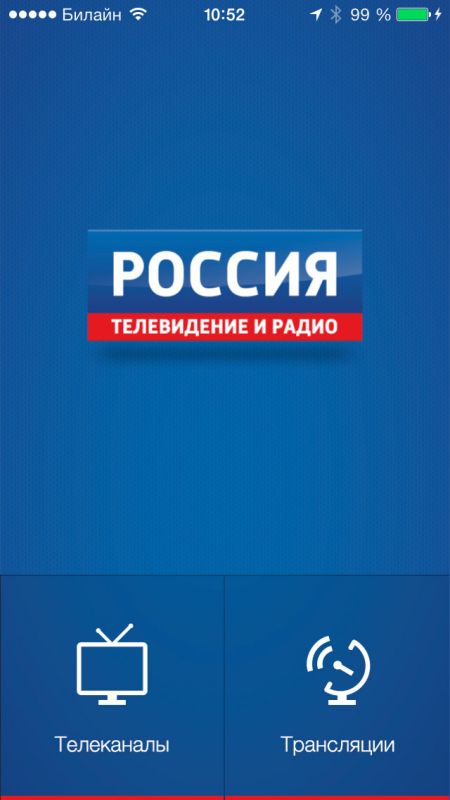 Россия. Телевидение и радио - официальное мобильное приложение Всероссийской государственной телерадиокомпании. Через данное приложение можно смотреть телеканалы «Россия 1», «Россия 2», «Россия 24», «Россия К», «Россия-РТР», «Москва 24». Реализована функция напоминания о начале интересующей пользователя программы. Можно слушать радио «Маяк». Просмотр трансляций возможен только при наличии интернета. Приложение обладает современным дизайном, хотя и не лишено недостатков, например, расположение кнопки "Назад" в правом верхнем углу экрана, что в iOS-приложениях смотрится крайне непривычно.
