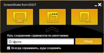 ScreenShoter from ENOT - простое приложение, с небольшим функционалом позволяющее сделать снимок экрана. Вы можете использовать горячие клавиши, выделять необходимые области и указывать путь для сохранения данных.