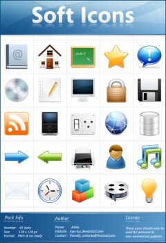 Используя Soft Icons, вы можете просто поменять стандартные иконка на вашем ПК, или использовать их во время создания графической оболочки для программы и вебсайта. В любом случае, иконки Soft Icons, выполненные в стиле Windows Vista, порадует любого вашего клиента своей красотой и изящностью.