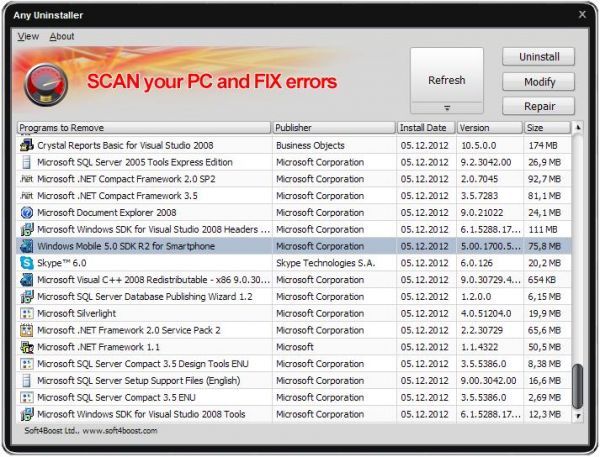 Soft4Boost Any Uninstaller является простым и удобным приложением, которое можно использовать, когда вам нужно полностью удалить какую либо из установленных в системе программ.