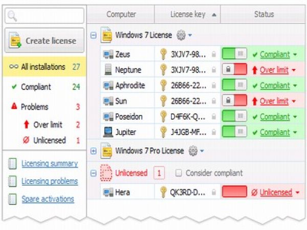 Данные об установках программ и имеющихся лицензиях становятся по-настоящему полезными при вычислении лицензионного статуса. Узнайте, где лицензий не хватает, а где есть лишние. Получите исчерпывающую информацию о проблемах с лицензиями.