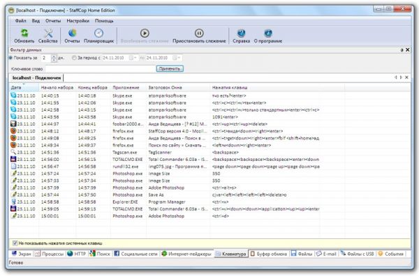 StaffCop Home Edition - это уникальная программа родительского контроля, которая обеспечивает детализированный отчет о действиях, выполненных на компьютере. Благодаря данной утилите, вы можете получить переписку из чатов, просмотреть все сайты, на которых побывал ребенок, также ведется сохранение изображений рабочих столов и многое другое. В общем, тотальная слежка с детализированным отчетом вам обеспечена.