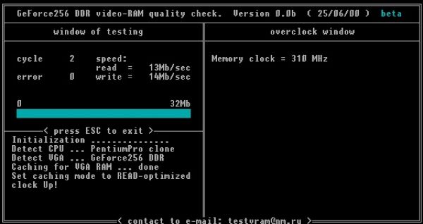 Основное предназначение программы TestVRAM (DOS) - тестирование видеокарт фирмы nVidia. Утилита прекрасно работает на картах: GeForce3, GeForce2, TnT, GeForce, TnT2. Во время работы, приложение запускается в обычном режиме и тестирует процессы таким же образом, как и обычную память. Однако имеются и некоторые нюансы. Если вы не включите кэширование, то существует высокая вероятность низкой скорости чтения и записи.