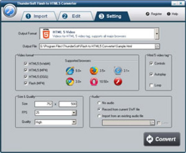 ThunderSoft Flash to HTML5 Converter позволяет преобразовывать Flash видео в формат HTML5. ThunderSoft Flash to HTML5