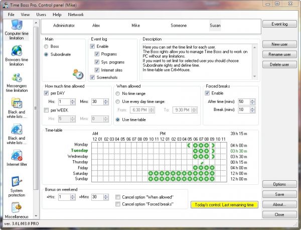 TimeBoss поможет вам ограничить время вашего ребенка, проводимое за ПК. Один раз установив настройки, вы больше можете не переживать за работоспособность юного поколения, которое так любит отвлекаться от уроков. Настраивайте общее количество часов в неделю или в день, которые вы считаете оптимальными. Например, вы можете создать интервалы во время работы, чтобы ребенок мог немного отдыхать от компьютера и потом вновь возвращаться к нему.