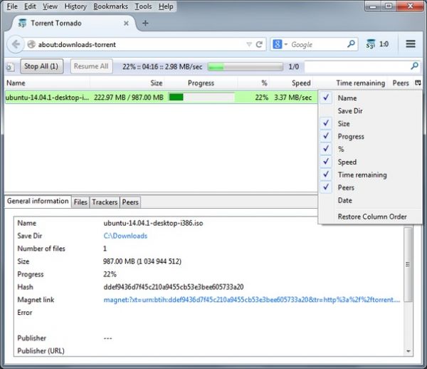 Торрент Торнадо - это простое дополнение для браузера Firefox. Главная задача дополнения, скачивать торренты. Теперь не нужно ставить специальную программу, чтобы добавлять закачки, ведь достаточно воспользоваться данным дополнением. Стоит отметить, что здесь не предусмотрено большого количества функций, но с главной задачей, приложение справляется на отлично.