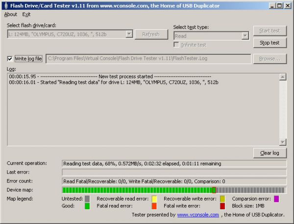 USB Flash Drive Tester - маленькая программа, которое поможет оценить качество съемного носителя. Утилита поддерживает следующие виды носителей: MMC, SD, USB-Flash, CF диски. После сканирования, программа отобразит нестабильные и битые сектора, если они имеются.