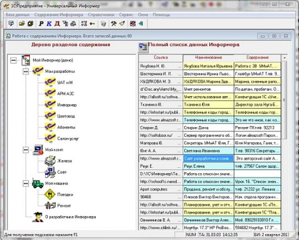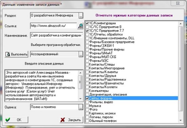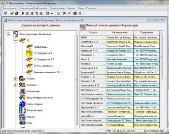 - Информер потому, что работает с информацией, вернее, со ссылками на источники информации. Приходилось ли Вам сталкиваться с такой ситуацией? Срочно потребовалась какая-то важная информация. Вы точно знаете, что раньше находили ее и положили куда-то, но не можете вспомнить, куда именнно. И начинаются долгие, мучительные, а часто и безуспешные поиски. В результате дело страдает. Информер положит конец этому безобразию. С ним Вы всегда быстро найдете нужную информацию и сможете ею воспользоваться. А Универсальный по 2-м причинам: · Во первых, потому, что может быть полезен всем людям, использующим компьютер, не зависимо от рода деятельности, профессии, образования и прочее, поскольку все они работают с информацией и занимаются поиском и сбором информации по интересующим их вопросам. · Во-вторых, потому, что каждый может настроить Информер «под себя», под свои потребности. Вы можете сформировать свою собственную структуру хранения информации, создать свои информационные разделы, классифицировать данные по интересующим лично Вас категориям, назначить данным нужные Вам программы-обработчики, применять свою собственную систему оценок содержания данных и использовать еще множество других индивидуальных настроек.
