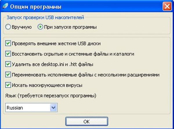 - возможность выбора типа запуска проверки USB накопителей ( вручную или автоматически )