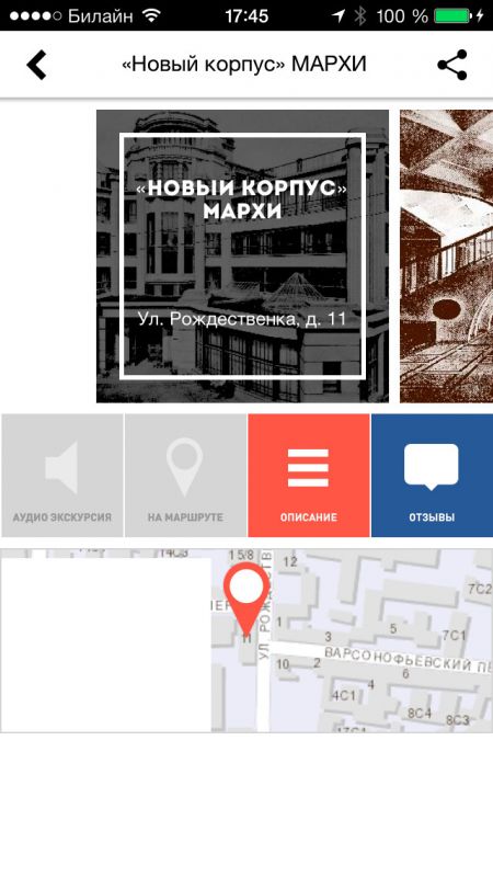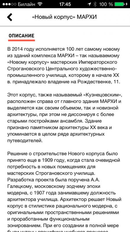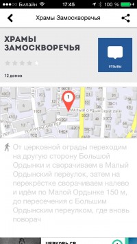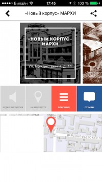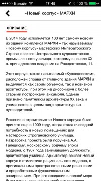 Узнай Москву - приложение от правительства Москвы содержит базу примечательных архитектурных сооружений, интересные маршруты для прогулок. Все здания отмечены на карте. Содержит звуковые записи с информацией о примечательных объектах, множество фотографий.