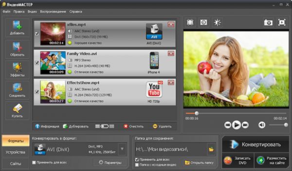 - Поддержка множества форматов для конвертации включая AVI, MP4, 3GP, FLV, MOV, MPEG, DAT, MKV, ASF.