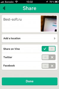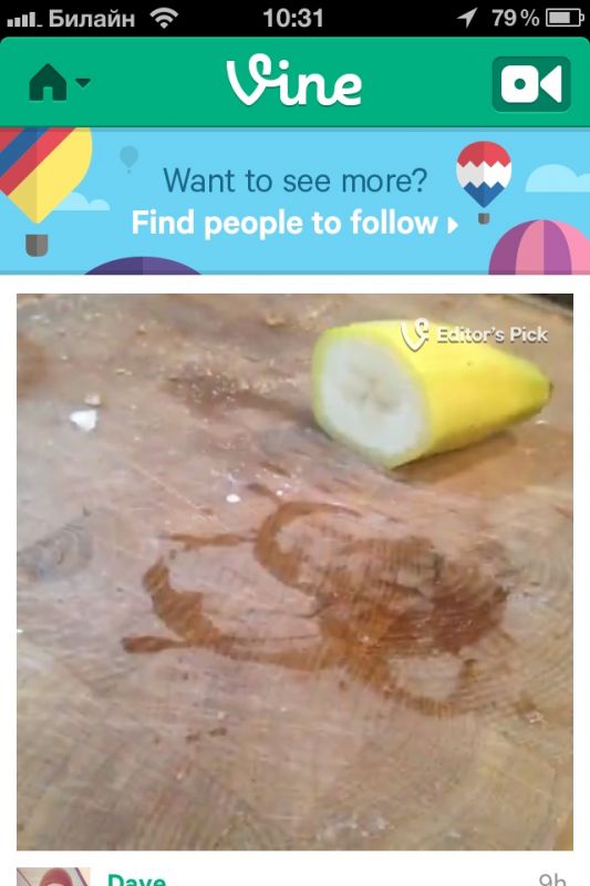 Vine - приложение от популярного сервиса микроблогов Twitter. С помощью Vine можно публиковать короткие видеоролики-твиты длинною не больше 6 секунд. Интересно реализована запись видео - запись видео происходит только тогда, когда палец касается экрана. Как только палец убирается, запись останавливается. Таким образом можно снять один ролик из множества фрагментов. Для работы с vine можно использовать аккаунт в твиттере.