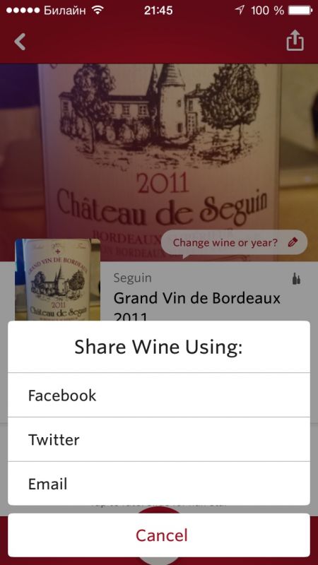 Как только бутылка распозналась вы получаете полную исчерпывающую информацию о вине. Производитель, средняя оценка других пользователей, отзывы пользователей и т.д.