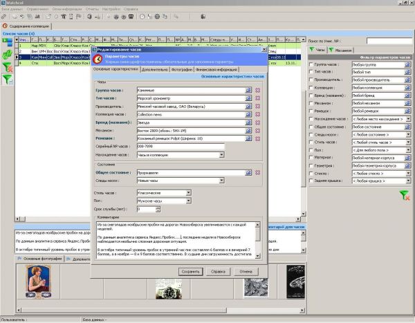 Мы можем передвигаться по главному списку часов, редактировать, удалять и добавлять новые часы в коллекцию. Также, мы можем вызывать окна справочников, чтобы вносить в них часто используемые компоненты - таким образом, мы постепенно заполняем справочники нужными значениями, и в дальнейшем, уже редко когда будем добавлять в них новые элементы.