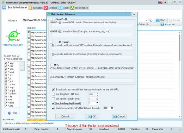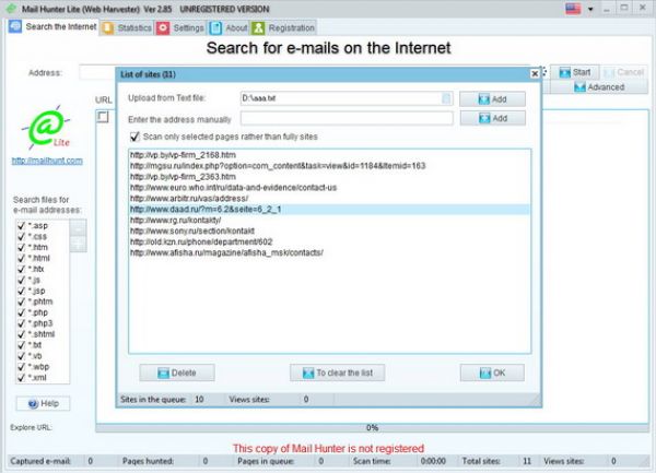 Web Harvester умеет работать с html, htm, php3, htx, phtml, txt, vb, css, js, php, txt и другими форматами. Все что нужно, это указать адрес сайта и запустить приложение, после чего начнется сбор. Также можно загрузить готовый список урлов и приложение самостоятельно обойдет все страницы каждого сайта и соберет базу!
