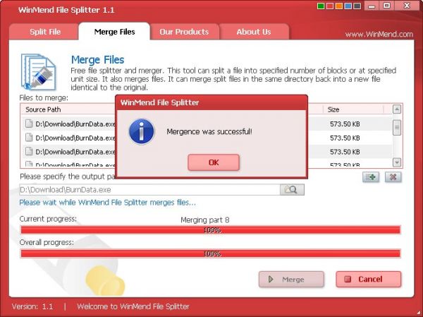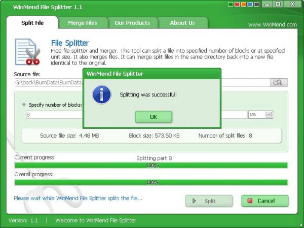 WinMend File Splitter - удобное приложение для разбития файлов на несколько блоков. В итоге, вы можете прикрепить отдельные фрагменты на съемных носителях, электронной почте, дискете, мобильном телефоне или другом устройстве. Когда потребуется, все файлы можно вновь объединить.