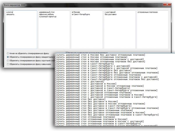 Wordkey может комбинировать все возможные фразы (включая даже одиночное слово) из 5 пяти пользовательских списков ключевых слов.