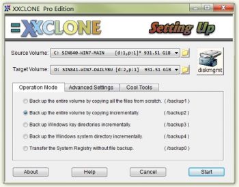 Весьма полезное приложение XXCLONE, с помощью которого можно выполнить резервное копирование системных файлов и всего диска на дополнительное оборудование. В итоге, все установленные программы, документы и папки, будут скопированы, и вы сможете в любой момент загрузить их.