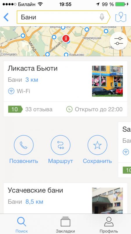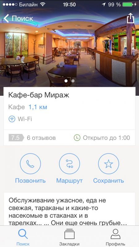Содержит список интересных мест, которые находятся поблизости (кафе и рестораны, бани и сауны, кинотеатры, аптеки и т.д.).