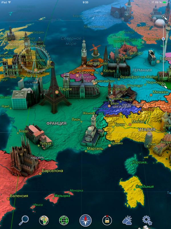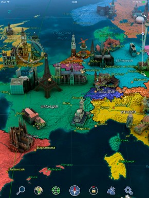 Интерактивный глобус, на который нанесены основные достопримечательности различных стран. Отличная, качественная, детализированная графика. Содержит почти полторы тысячи различных объектов. Несколько сотен достопримечательностей. На глобусе также показывается текущая погода в выбранной области.