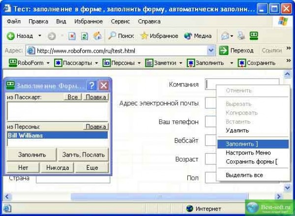 RoboForm – это Менеджер Паролей и Заполнитель Веб-форм, полностью автоматизирующий ввод паролей и заполнениe форм. RoboForm: - Запоминает Ваши пароли и автоматически вводит данные. - Заполняет большие регистрационные формы одним щелчком. - Шифрует Ваши данные для полной безопасности. - Генерирует пароли, которые невозможно подобрать. - Противодействет фишингу, сверяя URL страниц. - Защищает от кейлоггеров при вводе паролей. - Создает резервные копии Ваших данных. - Синхронизирует Ваши данные с использованием GoodSync. - Осуществляет поиск в Ваших данных и в Интернет