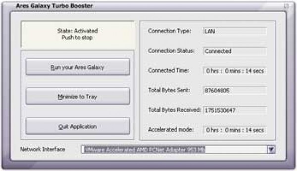 Ares Galaxy Turbo Booster является отличным ускорителем для Ares - программы обмена файлами. Высокотехнологичность архитектуры и приятный интерфейс, делают Ares Galaxy Turbo Booster обязательным элементом для любого пользователя Ares.