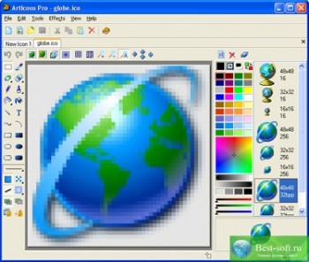 ArtIcons позволяет про-фессионалам и любителям создавать и редактировать иконки и работать с библиотеками иконок. Поддерживается экспорт и импорт множества графических форматов. Имеется русскоязычный интерфейс.Этот редактор иконок вам поможет Cоздавать иконки различных размеров с палитрой до 16 миллионов цветов; Редактировать 32-битные иконки с 8-битным альфа кана-лом; Рисовать с помощью всевозможных графических инструментов, включая различные виды заливки; Создавать тень в 32-битных иконках в стиле Windows XP; Импортировать и импортировать .ico, .icpr, .bmp, .jpg и .png файлы; Извлекать иконки из ехе-файлов Windows, библиотек; Создавать библиотеки иконок для более эффективного хранения; Искать иконки в папках и файлах и собирать их в библиотеки; Удалять идентичные иконки из библиотек; Использовать русский или английский интерфейс.