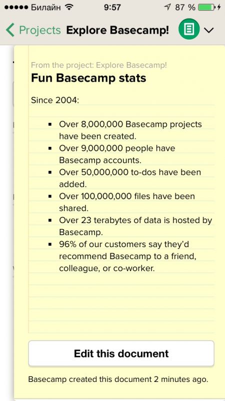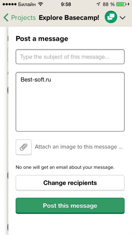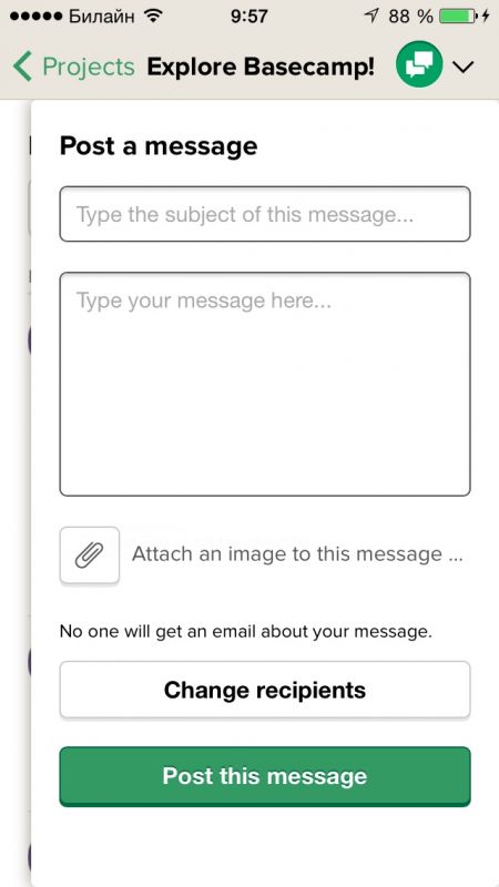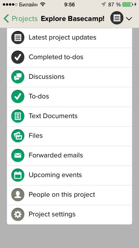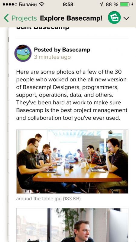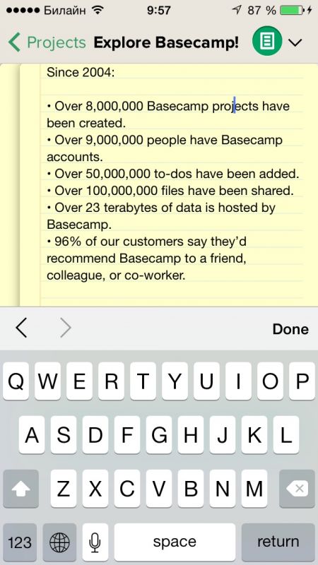 Бейскемп позволяет вам управлять проектом прямо через мобильное приложение в айфоне. Добавление новых сотрудников, определение их ролей, постановка задач, оперативное слежение за ходом выполнения задач, загрузка файлов и картинок, комментирование всего на свете.