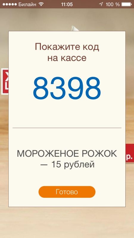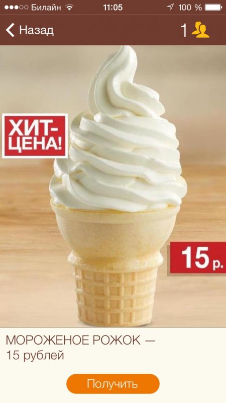 Например, на момент написания обзора идет акция - мороженное за 15 рублей. Чтобы получить мороженное, достаточно выбрать эту акцию в списке и показать экран приложения на кассе и вам дадут дешевле мороженное.