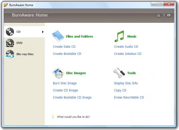 BurnAware Home - программа для записи дисков. Версия для домашних компьютеров и ноутбуков. Включает в себя дополнительные утилиты, с помощью которых вы можете легко создавать CD и DVD с цифровыми фотографиями, документами, играми, фильмами и музыкой. Также с помощью BurnAware Home вы можете создавать загрузочные диски и образы дисков (ISO).