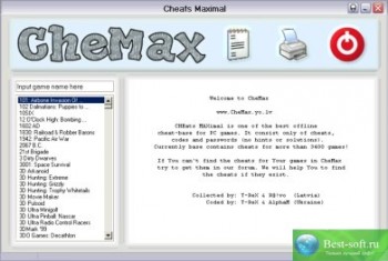 CHEats MAXimal Rus - наибольшая русскоязычная база с чит кодами для компьютерных игр. Простой и красивый интерфейс, малый размер, и при этом огромное количество представленных игр. Особенностью базы является отсутствие в ней хинтов и прочей “отсебятины“, вашему вниманию представлены только коды (cheats, hex-cheats) и пароли (passwords ). Программа CheMax Rus является переводом чит базы от программы CheMax.